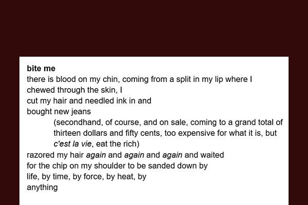 I am something slimy and ashy and sick Dry as a bone and still too slick to keep hold of A black pearl slipping between your gnawed fingers and rolling…